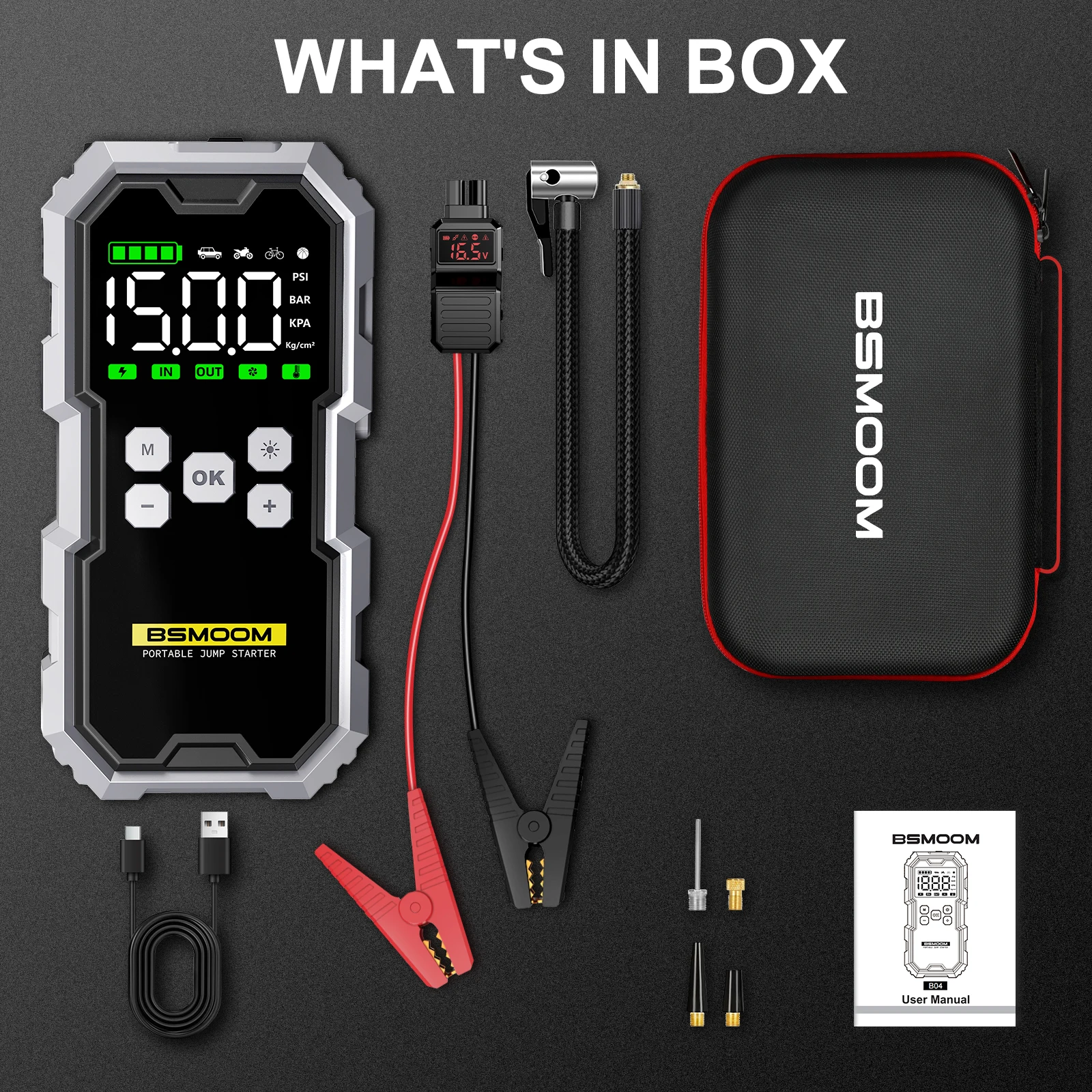 SMART DIGITAL TIRE INFLATION FUNCTION: The BSMOOM jump starter battery pack features an LED smart screen and advanced tire pressure detection, providing crucial information such as battery level, inflation mode, and real-time tire pressure. Supporting four units (PSI, BAR, KPA, KG/CM), the 150PSI air compressor efficiently inflates a normal car tire to 20PSI in about one minute, making it easy to use and highly convenient.