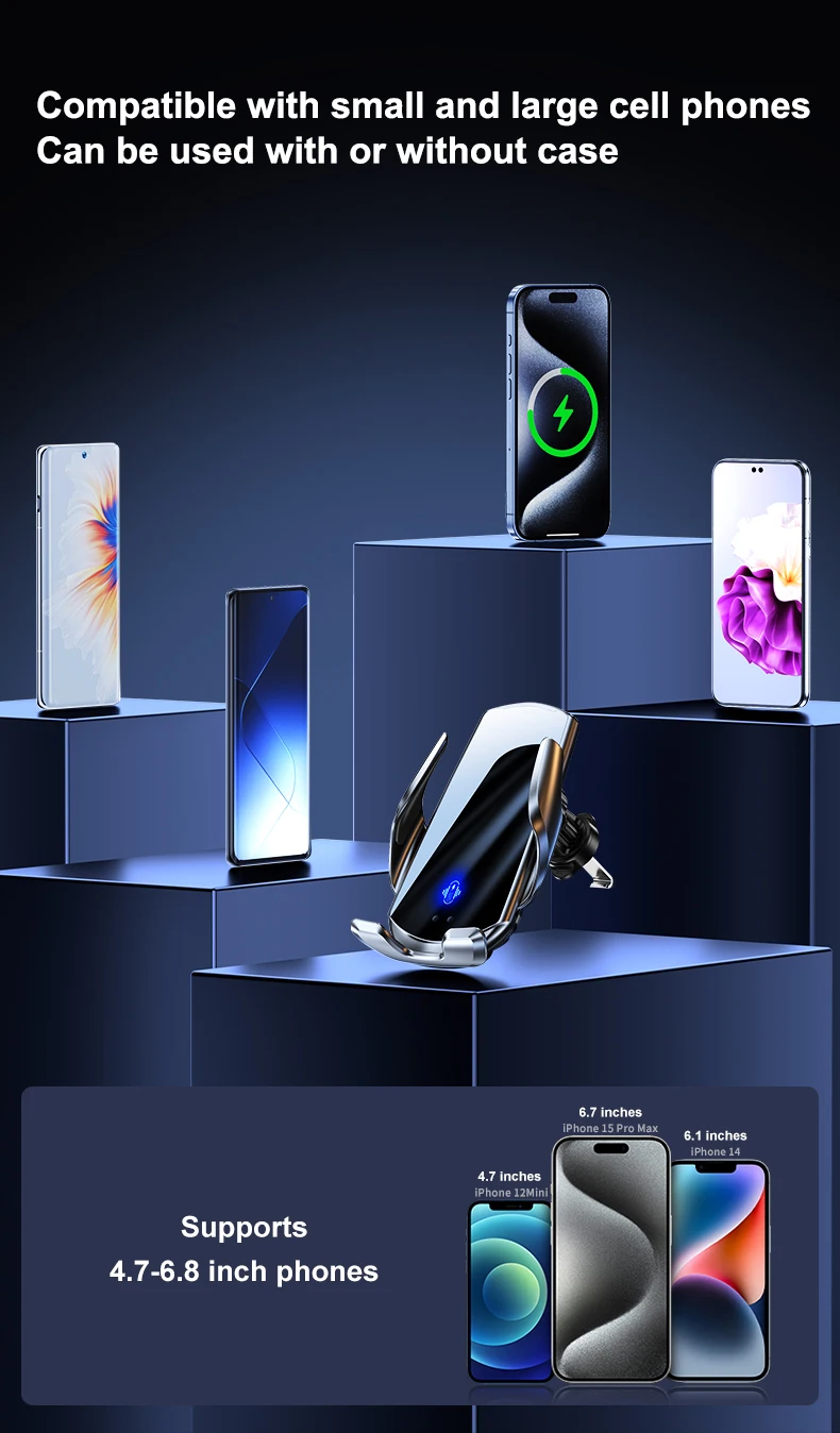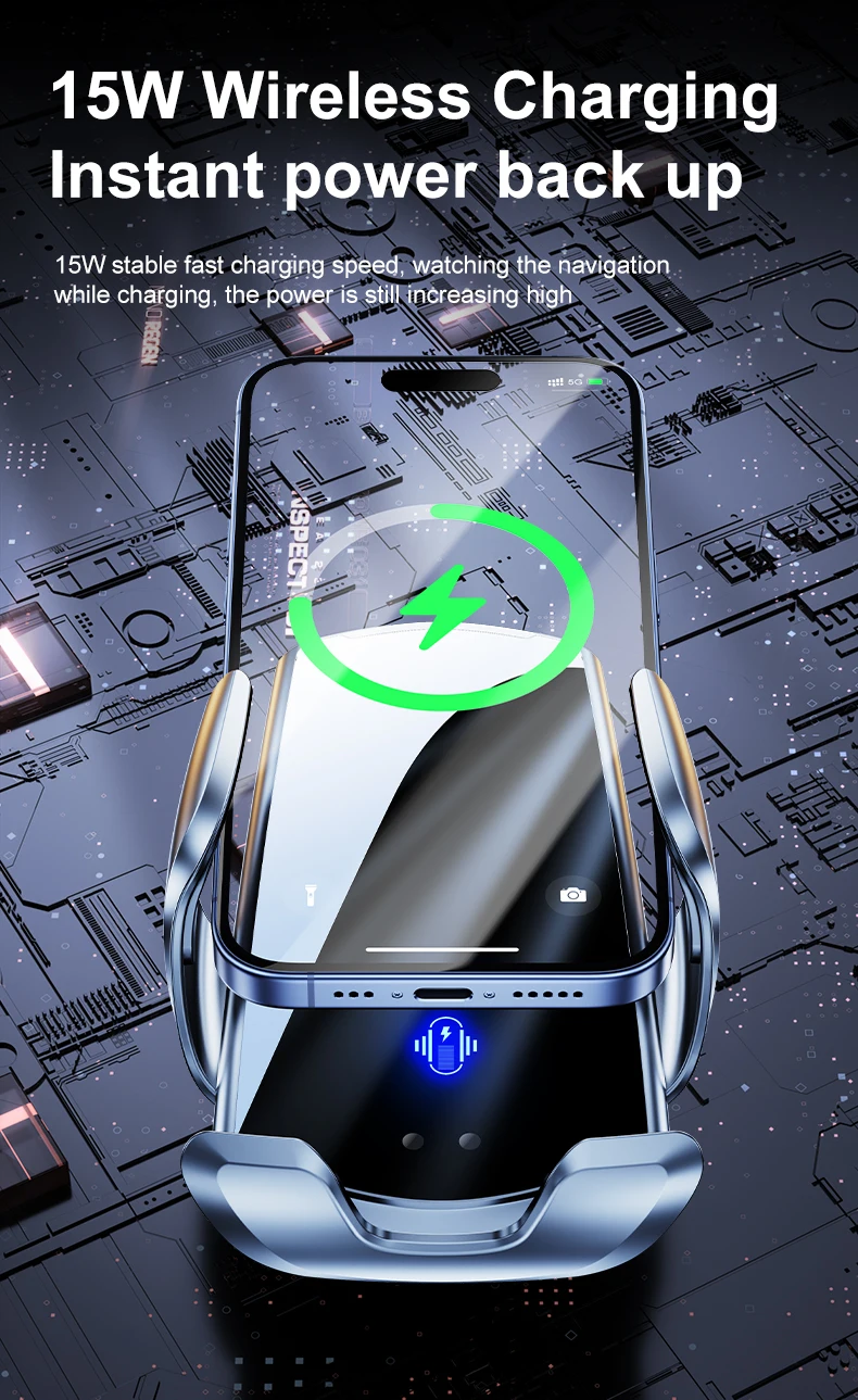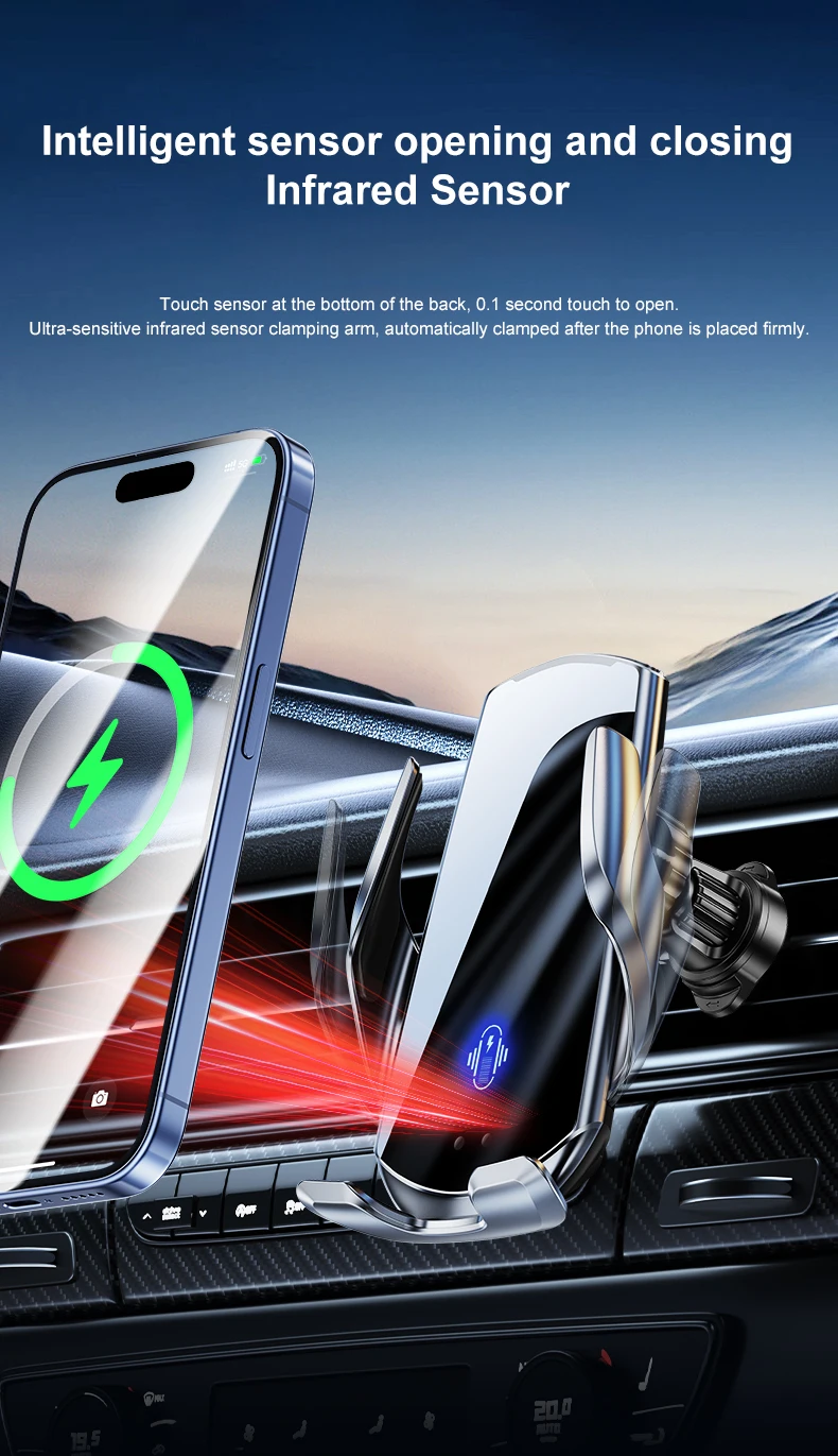 15W Auto-Sensing Wireless Charger – Fast Charging, LED Indicator, Universal Phone Compatibility, Secure Car Mount