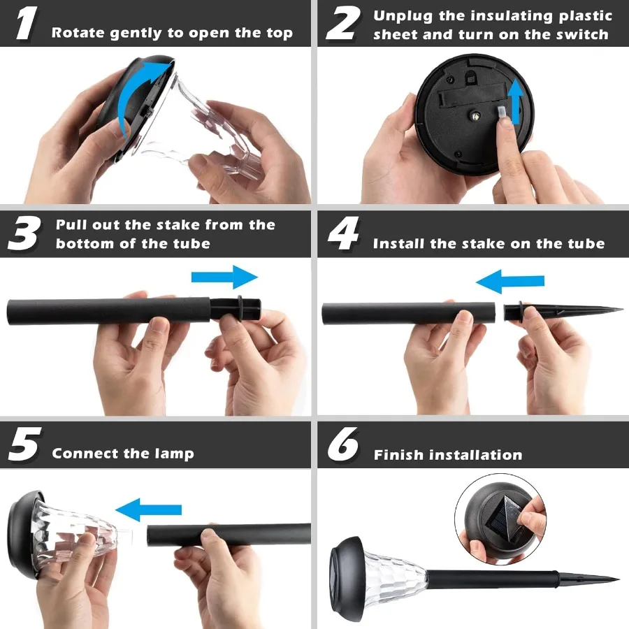 【Quick and Easy Installation】No tools required – just follow a few simple instructions. Wireless set up and operation. Just turn your lights ON with a simple switch and push them into the ground with a sturdy stake. See simple steps below