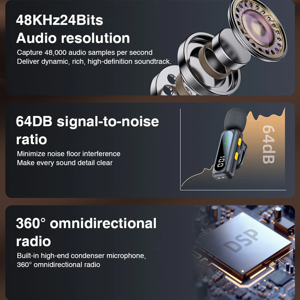 Features: 1.Professional Noise-Cancelling Mini Microphone: Our wireless lavalier microphone features a professional intelligent noise-cancelling chip and advanced 2.4 GHz transmission technology, achieving ultra-low latency to reduce noise accurately even in noisy outdoor environments, ensuring clear sound quality and recording. 2.Multi-Function Wireless Microphone: This versatile mini mic offers various effects such as mute, original sound, noise reduction, and reverb. Its unique 360° magnetic rotating design ensures ease of use. The indicators display power, connection, and activity status clearly for precise audio control. Equipped with both Light-ning and USB-C adapters, it seamlessly connects to various phone models. 3.Long Battery Life: This wireless microphone provides up to 12 hours of battery life (6 hours per mini microphone), ensuring uninterrupted recording sessions. Each mini microphone transmitter comes with a 70 mAh battery that charges fully in just 1.5 hours, saving you time. With a wireless microphone range up to 65 feet/20 meters, freedom of movement is ensured. 4.Plug and Play Wireless Mic: No additional software or Bluetooth-compatible pairing needed. Simply insert the receiver into your phone and turn on the magnetic microphone to automatically pair. Enjoy effortless recording. The included dual-purpose charging cable can charge both wireless mini microphone transmitters simultaneously. The receiver has a USB-C charging port for recharging. 5.Extensive Compatibility: This wireless microphone for Android systems is compatible with a variety of devices, including for Android phones, for iPhones/for iPads with Light-ning or USB-C ports, laptops, for iMacs, desktops, and more. for video recording, video podcasts, for , for YouTube, live streaming, interviews, meetings, and beyond.Specification: Product material: ABS Microphone size: 65*23*15mm Frequency range: 2.4GHz Transmitter working current: 11-12mA Power-on current: 10-11mA Receiver working current: 20-21mA Receiver power-on current: 8-9mA Power-off current: 2-3uA Working temperature: -10 to 45mA Charging input voltage: DC4.8-5.4v Working time: 5-6H Charging interface: TYPE-C Charging time: about 75min Charging current: about 60mA Microphone battery capacity: 70mAH Battery full voltage: 4.1-4.25V Transmission distance: barrier-free distance 20 meters Signal-to-noise ratio: 64 dBm Transmission delay: 9-18MS Sensitivity (microphone): -42dB Microphone: Silicon microphone Antenna type: Ceramic antenna Frequency response range: 20-20KHZNote: Due to different monitor settings and lighting conditions, the actual color of the item may vary slightly from the pictures. Thanks for your understanding! Please allow a 1-2 cm difference in measurements due to manual measuring.