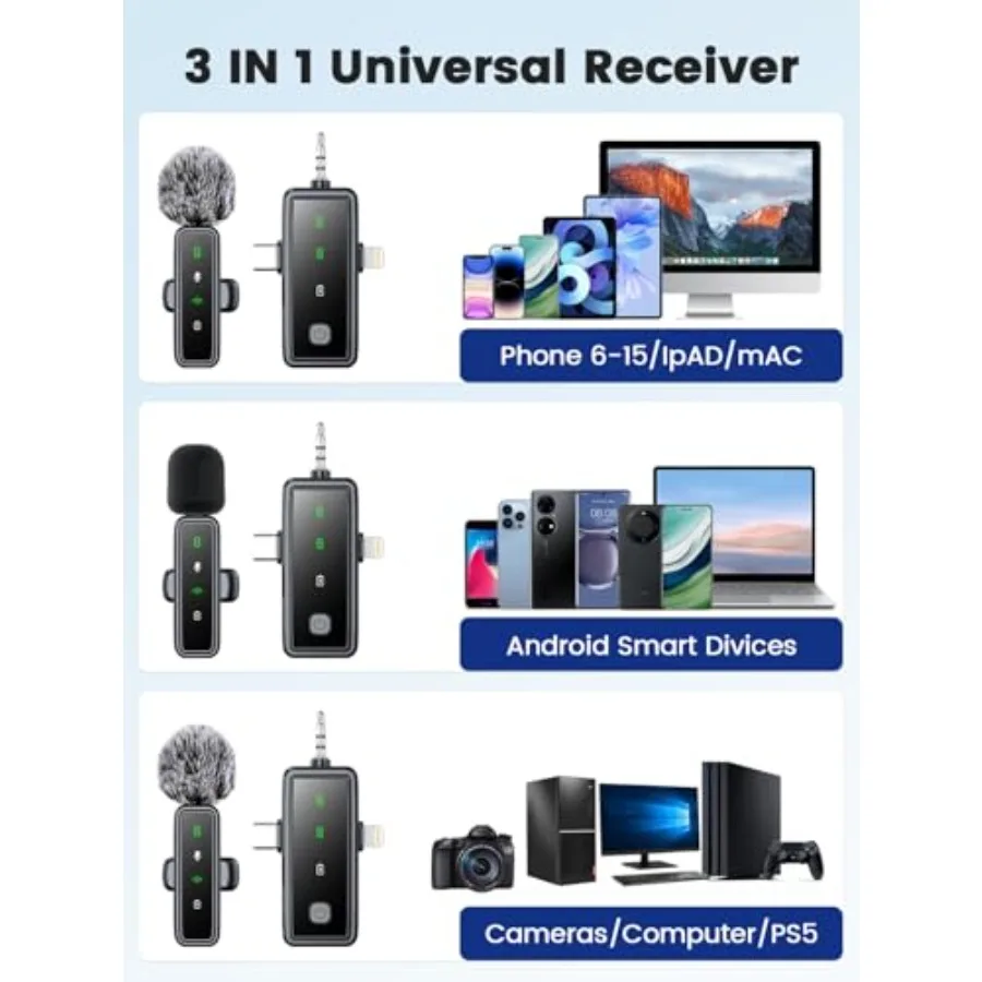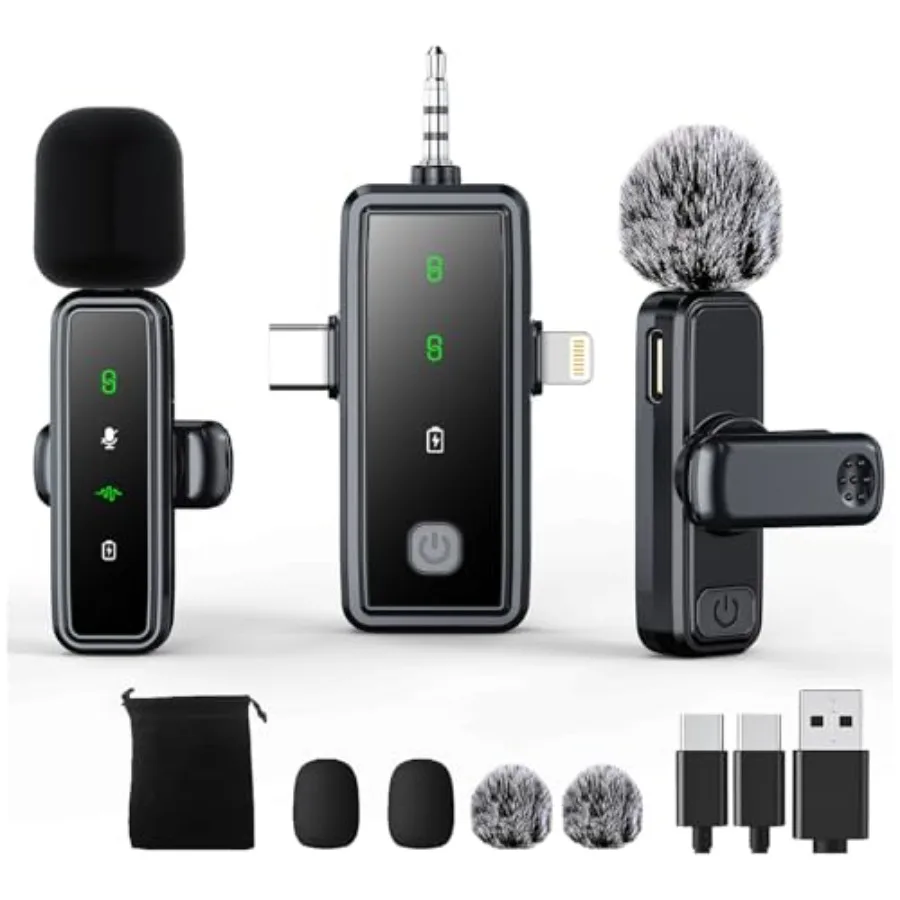 3 in 1 Wireless Lavalier Microphones for iPhone Android Camera 2 Pack Mini Microphone LED Display Lapel Omnidirectional Mic wit