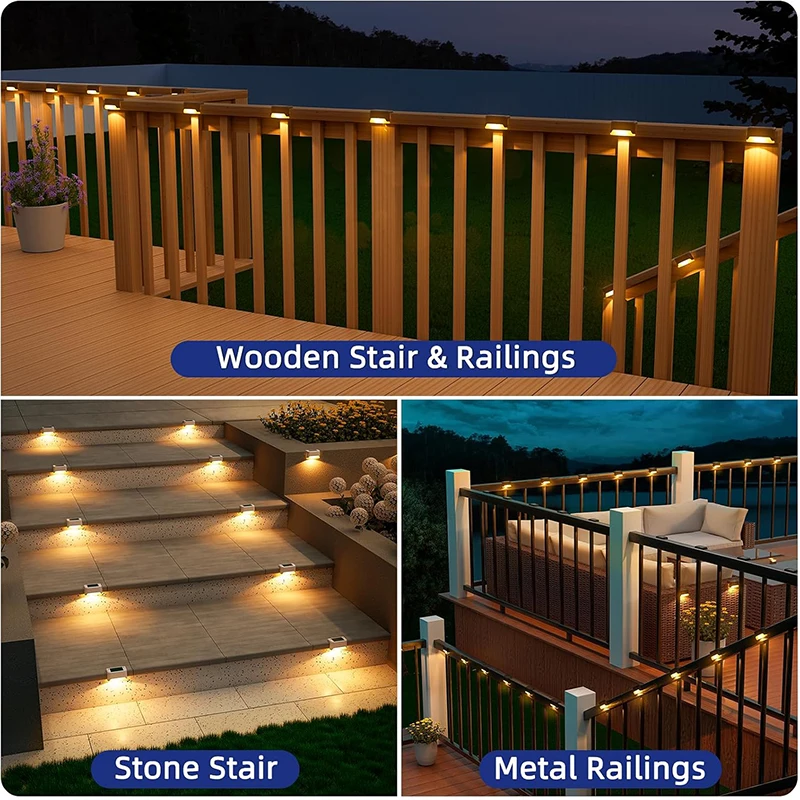 Our solar deck light is warm light, more suitable for eye protection, especially for children's eyes. Our solar step light perfects for stairs, path, deck, garden, and fence.
