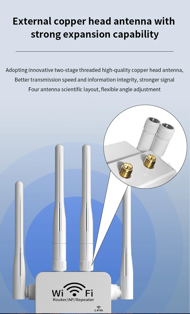 4 External Antenna: 4 external high enhancement omnidirectional antennas to enhance anti-interference ability. Significantly improve the sensitivity of reception and release. The coverage is wider and the signal continues to arrive. Avoid WiFi blind spots.