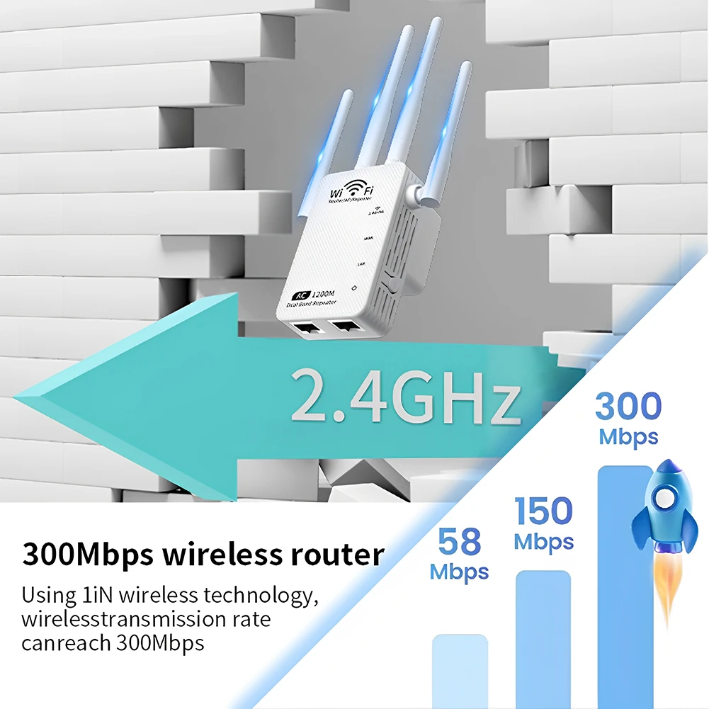 1200Mbps Dual Band: This WiFi booster uses dual band technology to expand WiFi signals for home gigabit dual band routers, allowing you to enjoy ubiquitous internet experience. It expands the coverage range of the network, avoids signal obstruction by walls, and makes the entire spatial signal stable.