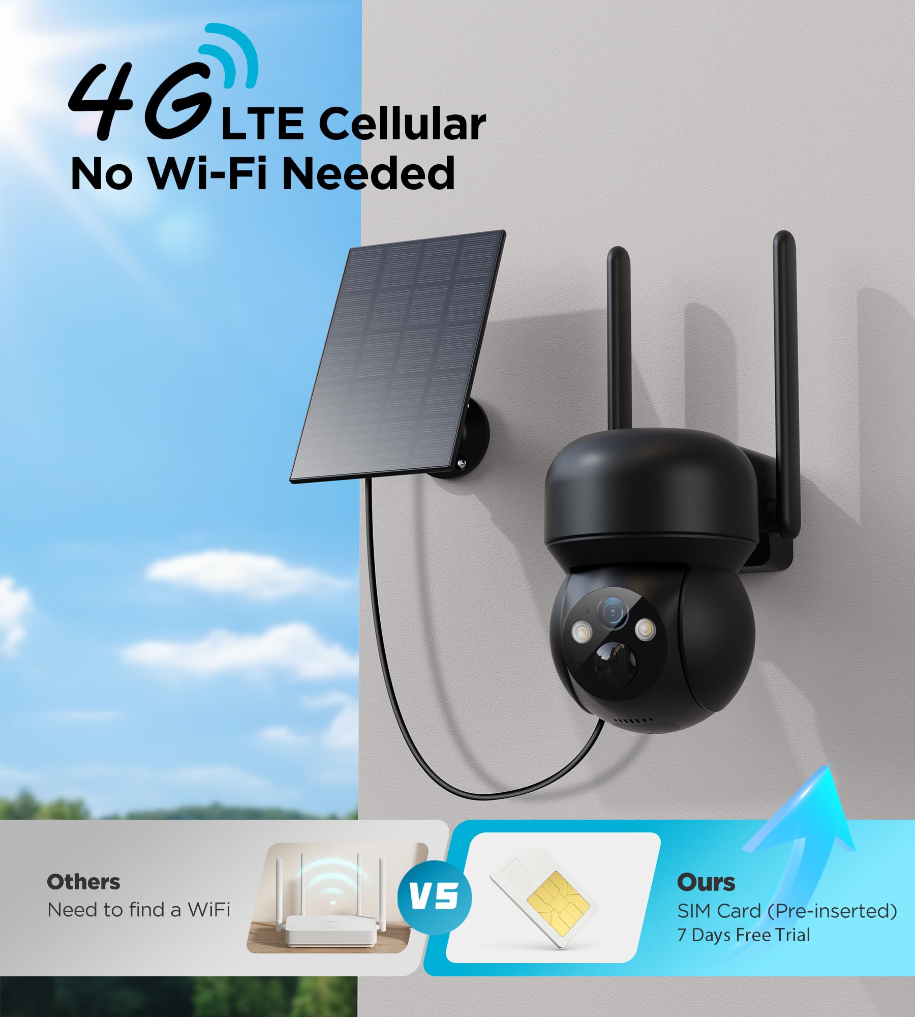 • [No WiFi & No Electrical Power Needed]If you need a outdoor security camera, but you live or work in a place there's no Wi-Fi, even wire.The 4G LTE solar security camera gonna be a wise choose!This cellular security wireless camera can work anywhere with 4G LTE coverage.Never mind about no Wi-Fi or no electrical power, such as barn, farm, ranches, construction sites, vacations homes, warehouse, RVs.(The 4G camera doesn't support Wi-Fi Connection)