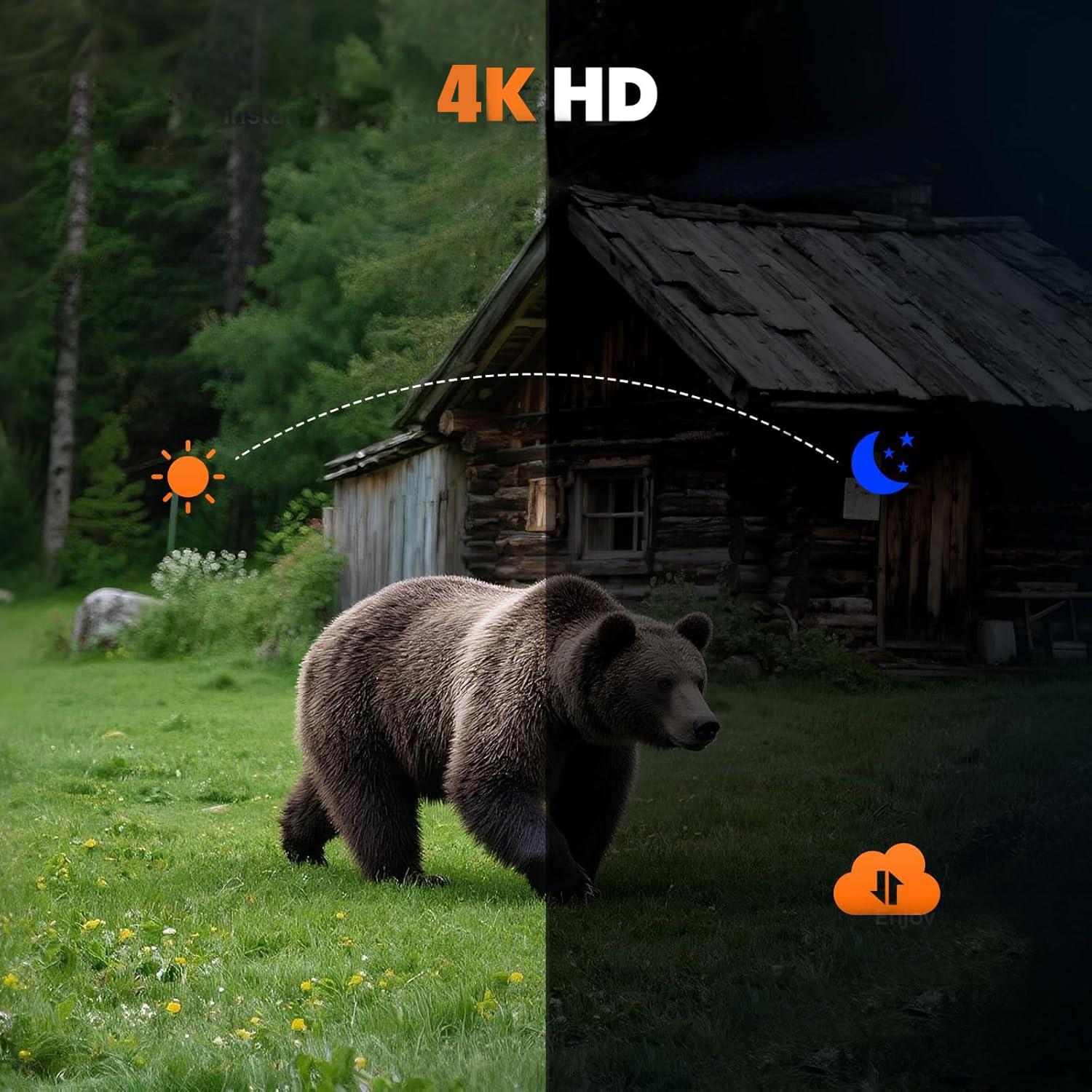 • [4K Color Night Vision & 360° View]This trail camera cellular offers 4K high resolution with 4X digital zoom, wide angle lens support horizontal and vertical rotation providing a wider and more flexible view angle.Even in the dark, the full-color night vision lets you always keep an eye on your assets.(Spotlight needs to be manually set on in the APP)
