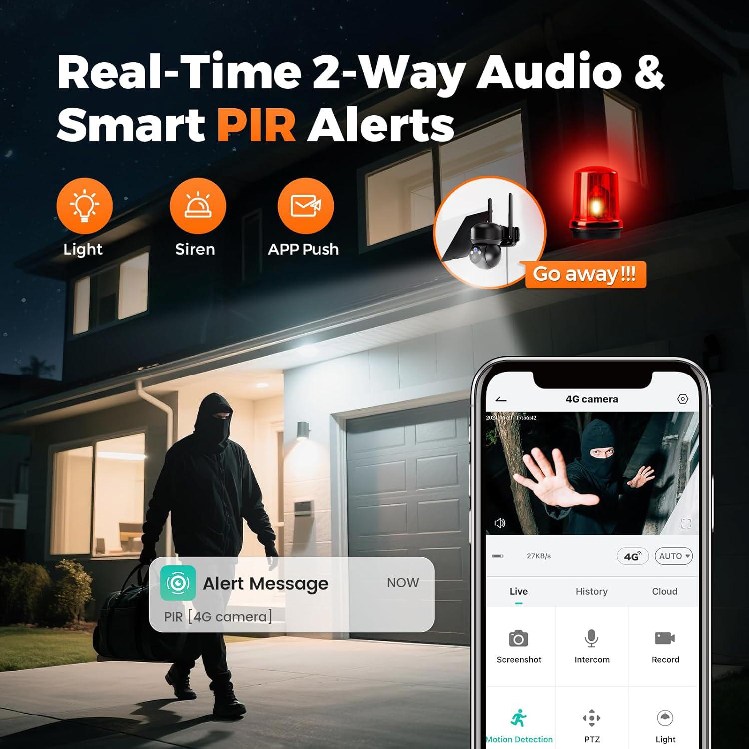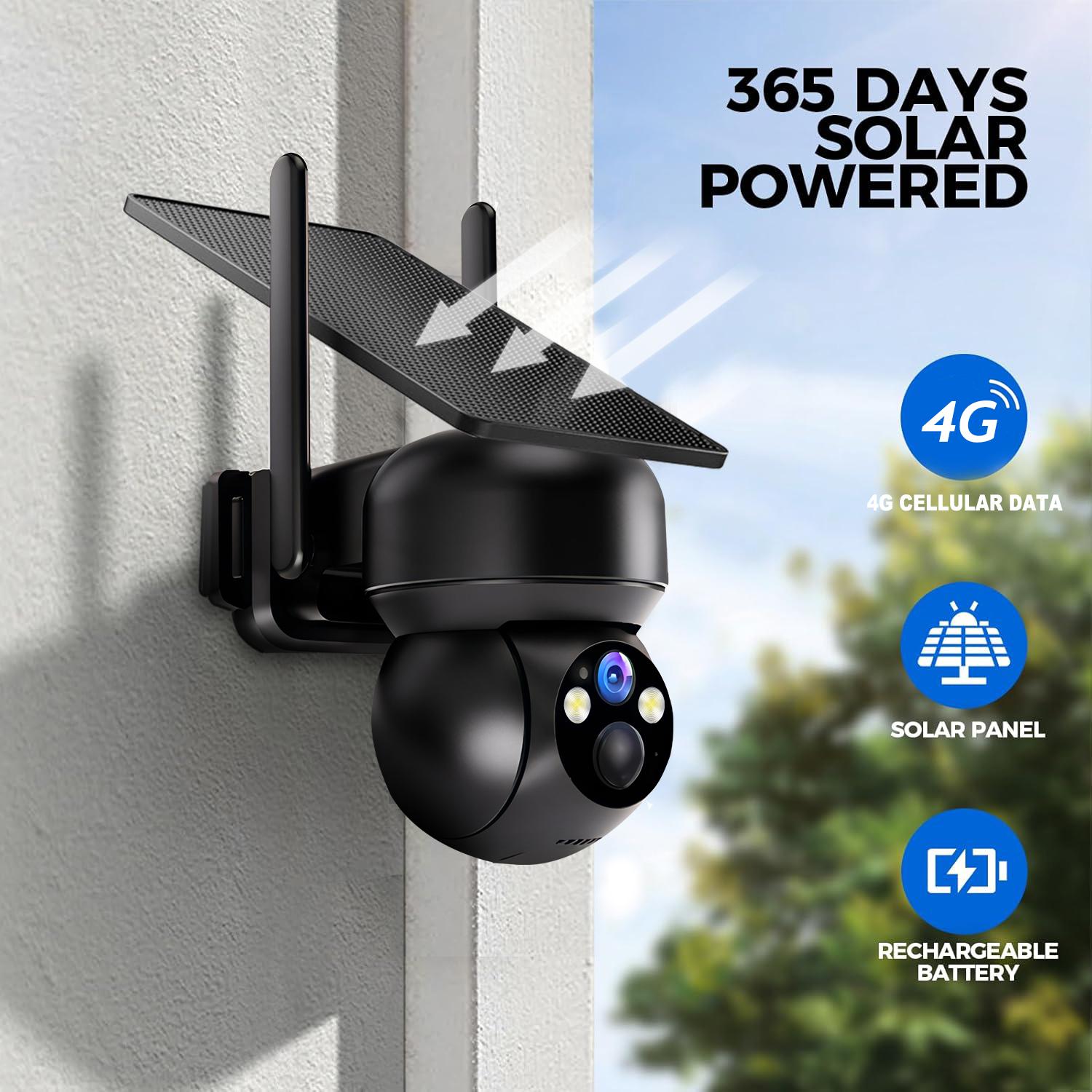 4G LTE Solar Security Cameras - 360° PT 4K Color Night Vision Security Camera System Remote Phone Control, 2-Way Talk, 2 Mins DI