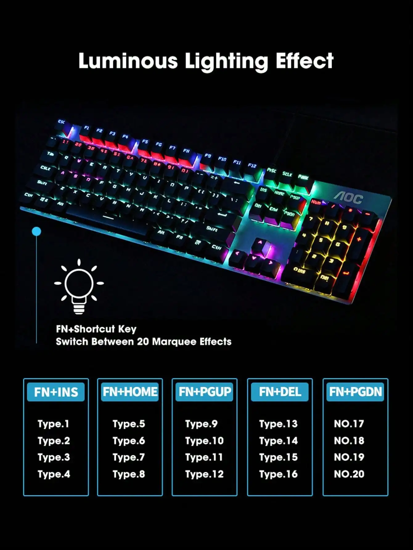 • FN+shortcut,Toggle between 20 marquee lighting effects