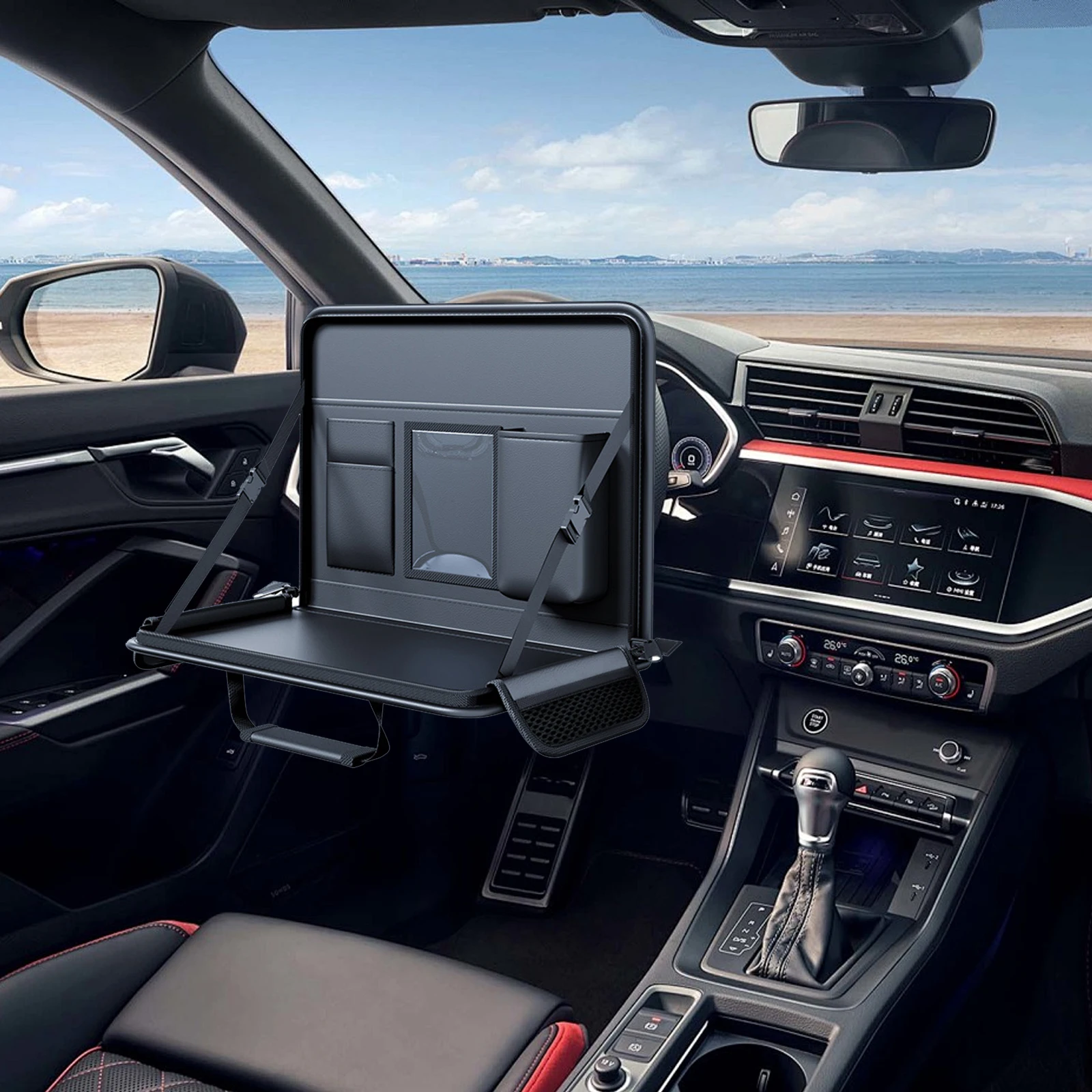 5.Safety Notice: Please do not use this car seat organizer table in front of the steering wheel while driving. Passengers can enjoy comfortable office or leisure time in the back seat during travel for added convenience.