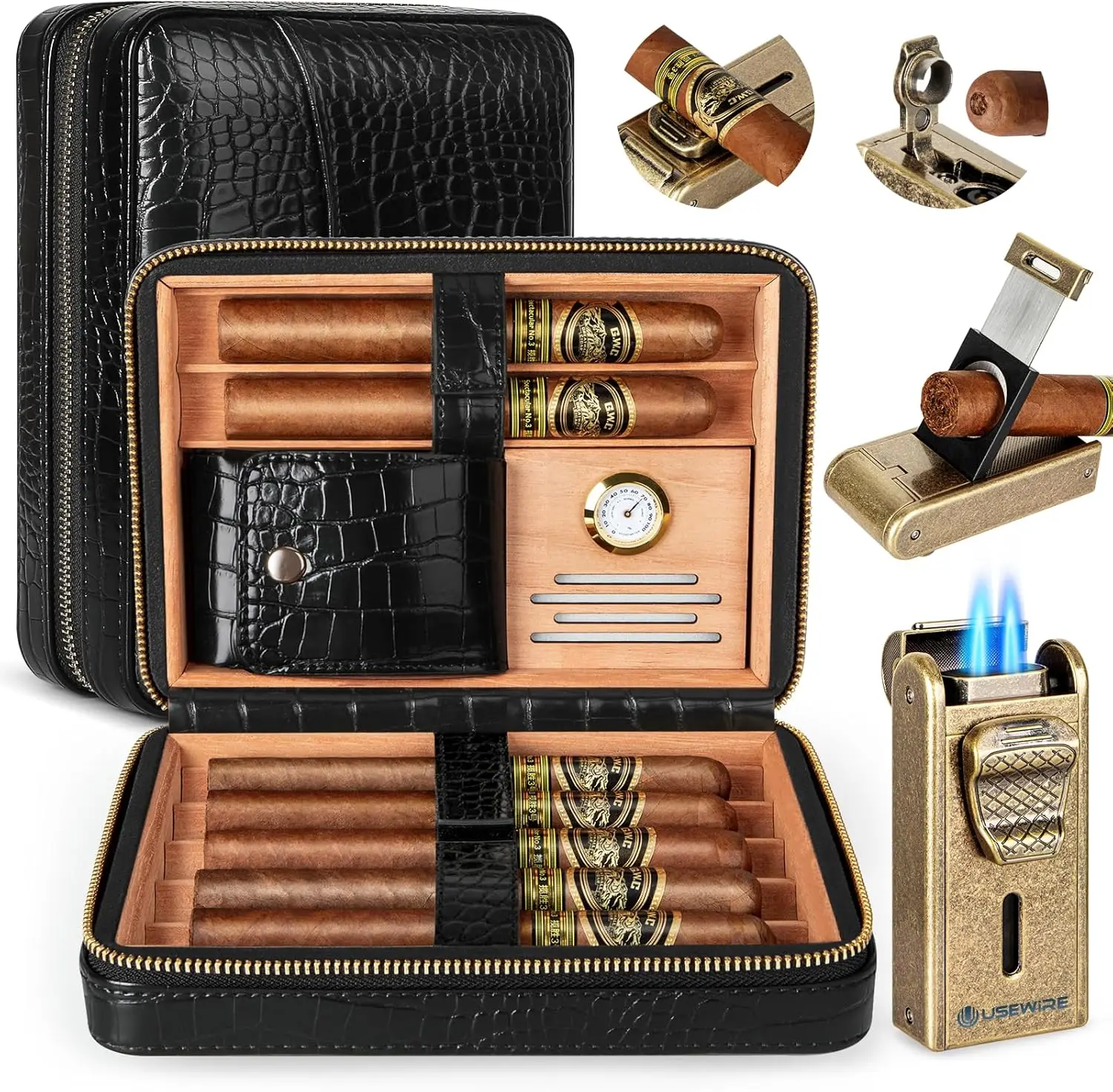 Cigar Lover Gift: Elegant cigar travel humidor and lighter set is packaged in an exquisite gift box package, perfect for birthday, Thanksgiving, Father's Day or Christmas, ideal gift for your father, husband or friend