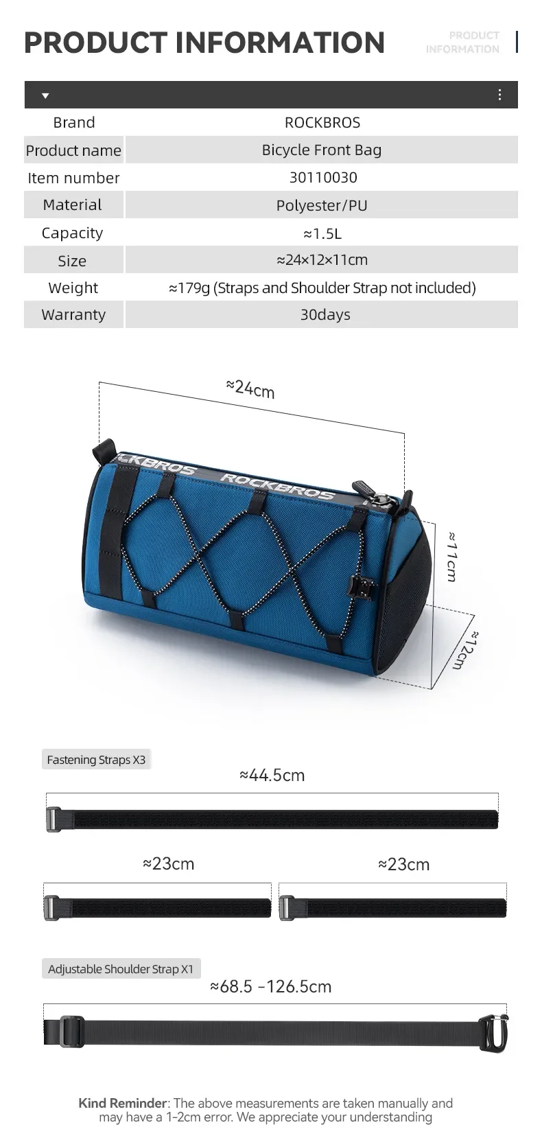 ROCKBROS Bike Handlebar Bag Portable 1.5L Multifunctional Shoulder Bag  Highly Reflective Strap Crossbody Cycling Frame Tube Bag
