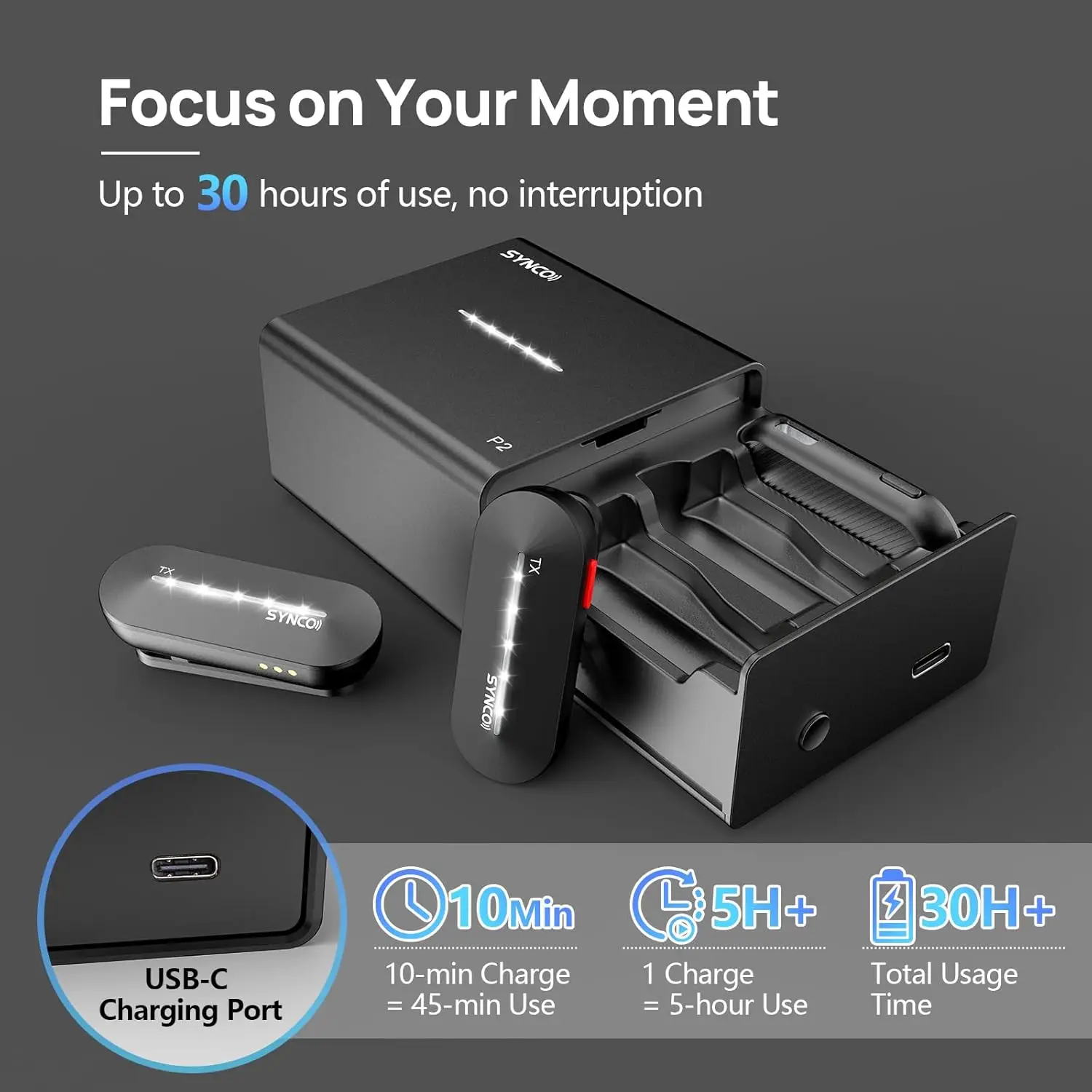 • 【Efficient Fast Charging and Long Battery Life】With just 10 minutes of contact fast charging, enjoy up to 45 minutes of use SYNCO P2ST. A single charge offers up to 5 hours of recording time, while the accompanying charging case holds two additional charges to keep you going all day long.